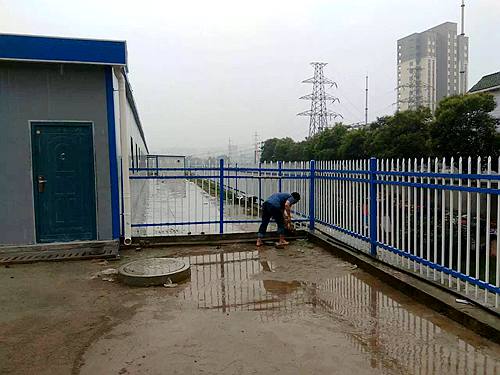 工人冒雨安裝藍(lán)白色鋅鋼護(hù)欄,只用1天就全部完成